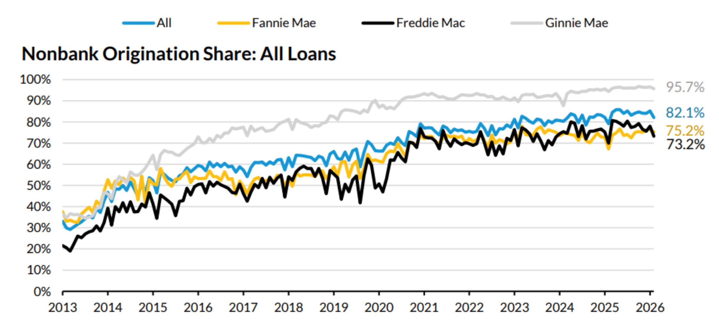 [1] Urban Institute, Housing Finance at a Glance: A Monthly Chartbook, Housing Finance Policy Center (March 2026), p. 13. https://www.urban.org/sites/default/files/2026-03/March%20v4.pdf. See also: Government Accountability Office (GAO), “Nonbank Mortgage Companies: Ginnie Mae and FHFA Could Enhance Financial Monitoring,” GAO-26-107436 (February 2026).